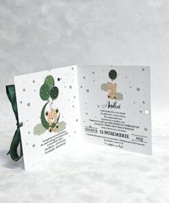 Adorabila Aventura a Ursuletului aduce gingasia copilului tau in prim-plan, prezentand un ursulet adorabil purtat de balonase verzi, completat de o fundita delicata care adauga un plus de rafinament si farmec.