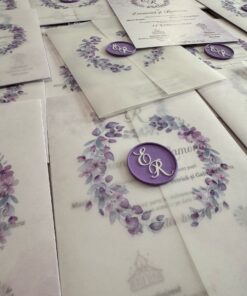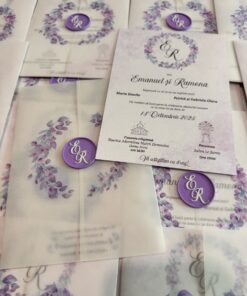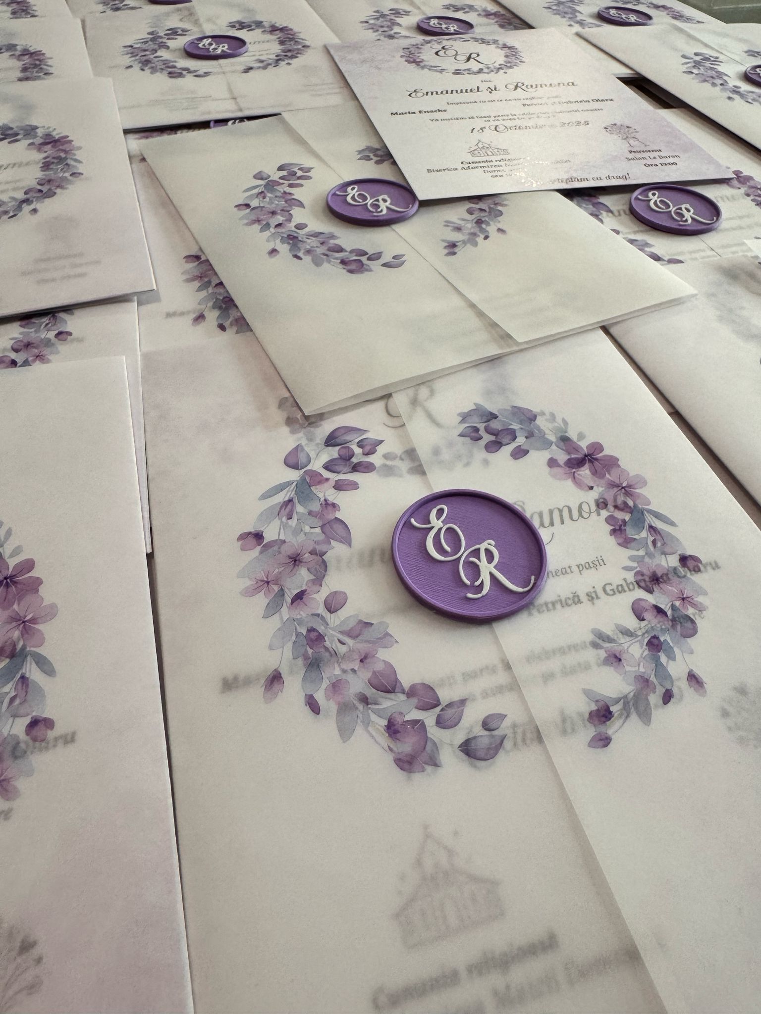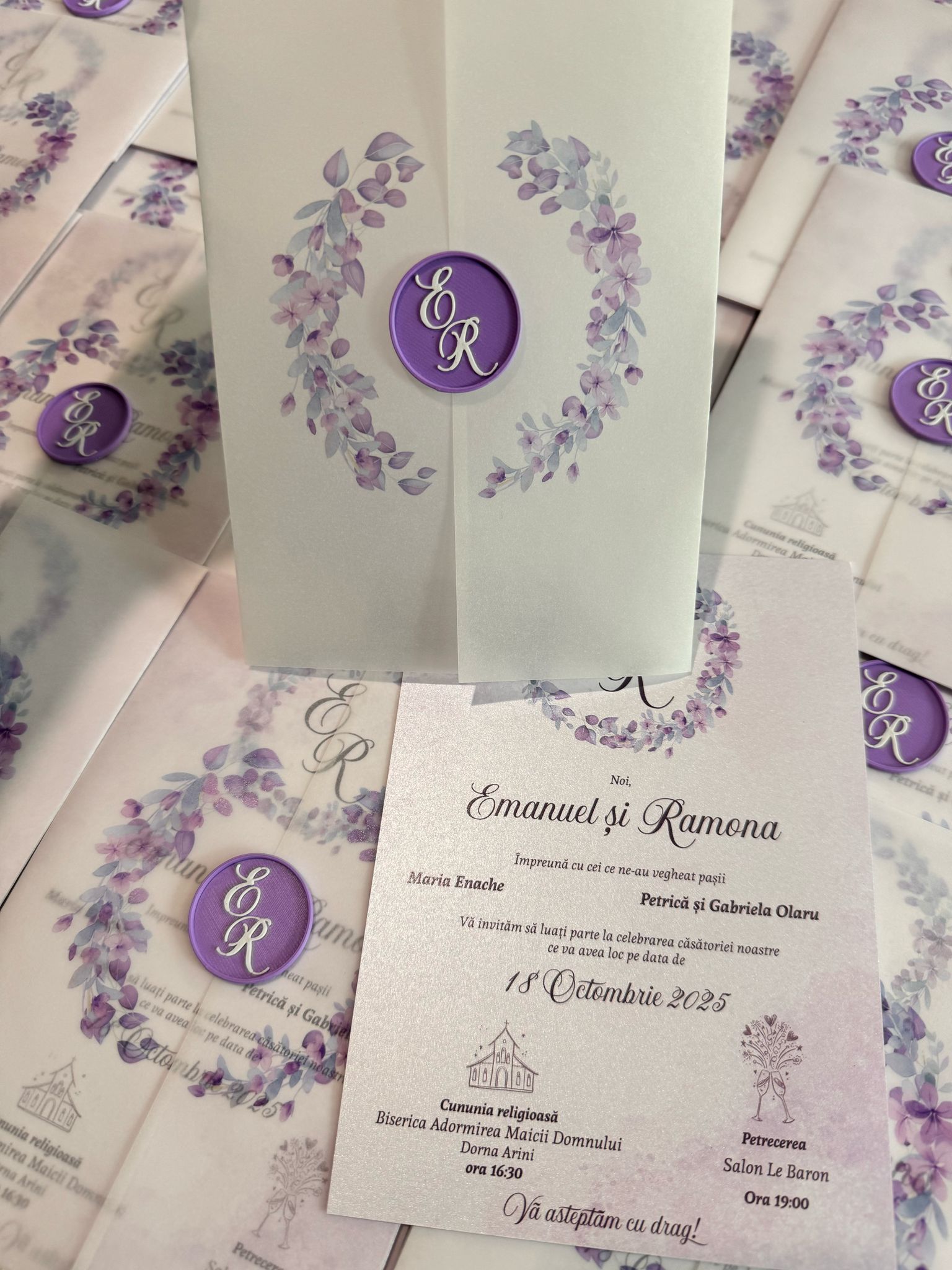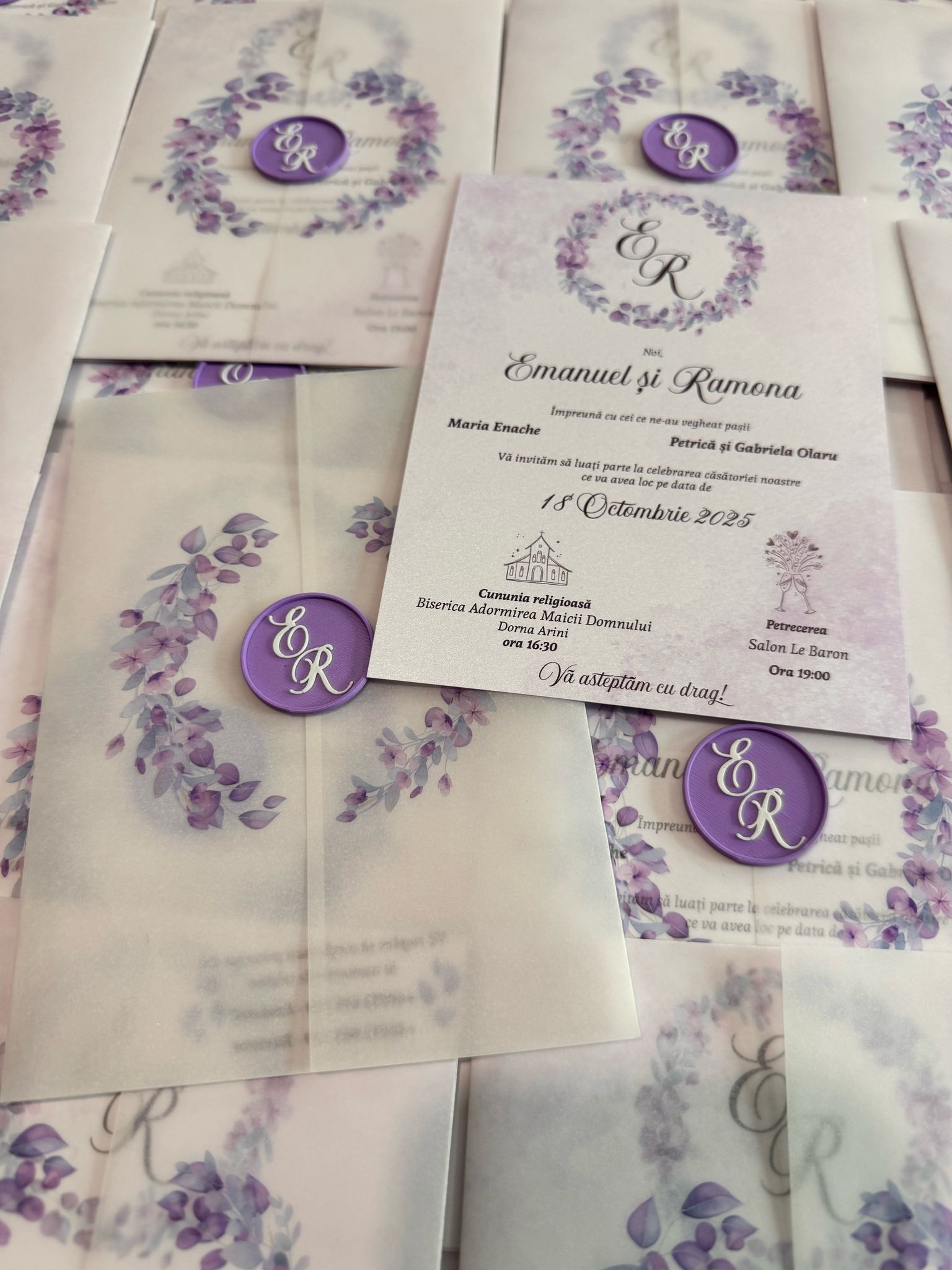 Finetea foitei de calc imprimata in culorile iubirii,in perfecta armonie cu nuantele de pe sigiliul personalizat cu initialele mirilor se imbina perfect cu grafica inspirata ce se regaseste pe un carton special. O invitatie ce aduce un aer tineresc al iubirii infinite in parfum de flori!
