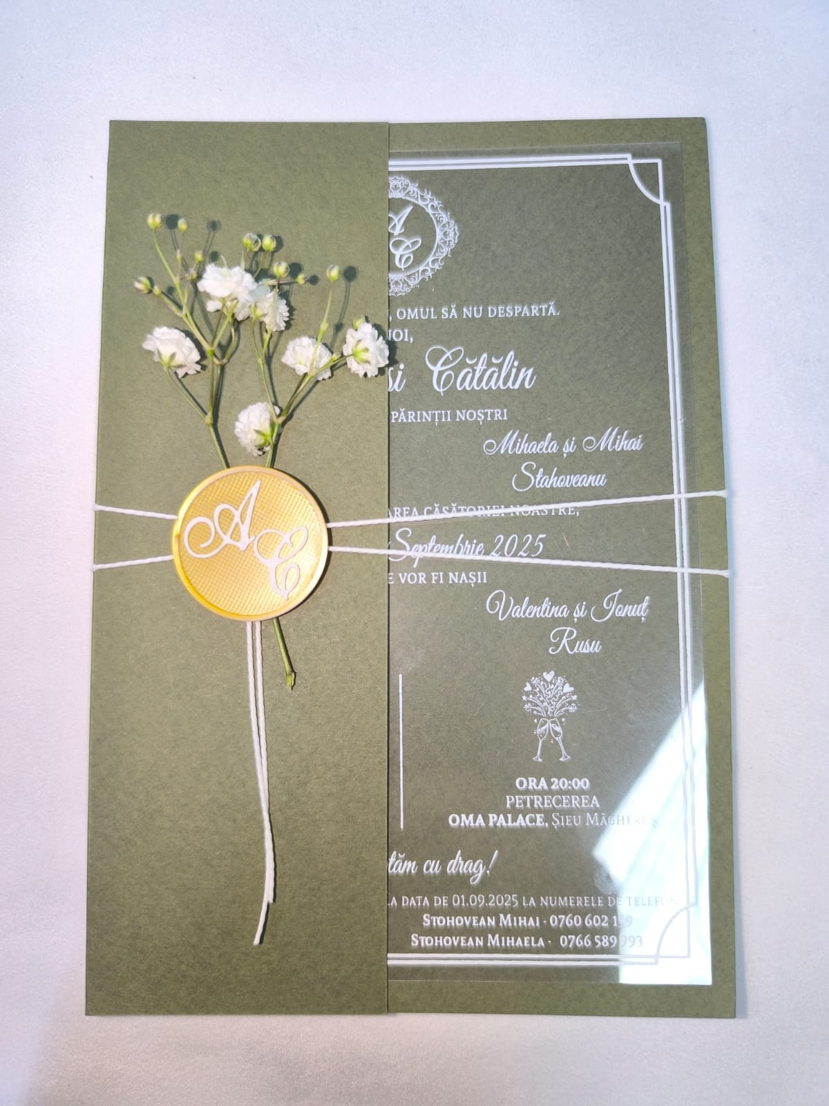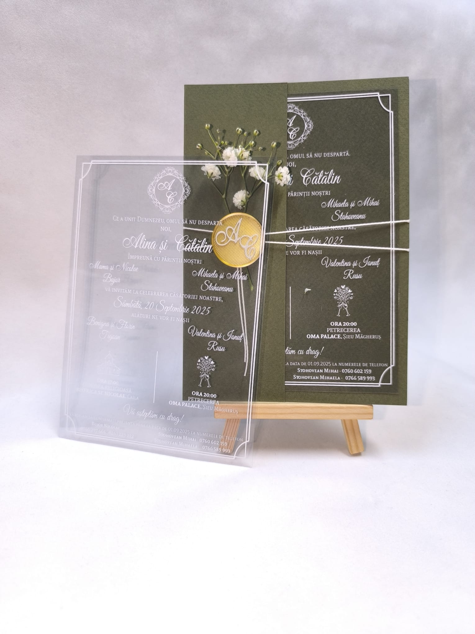 Culoarea superba a cartonului ales desavarseste o invitatie de exceptie, unde frumusetea albului imprimat pe plexiglas transparent poate iesi in evidenta si se poate armoniza intr-un mod sublim cu siretul alb si floarea miresei!