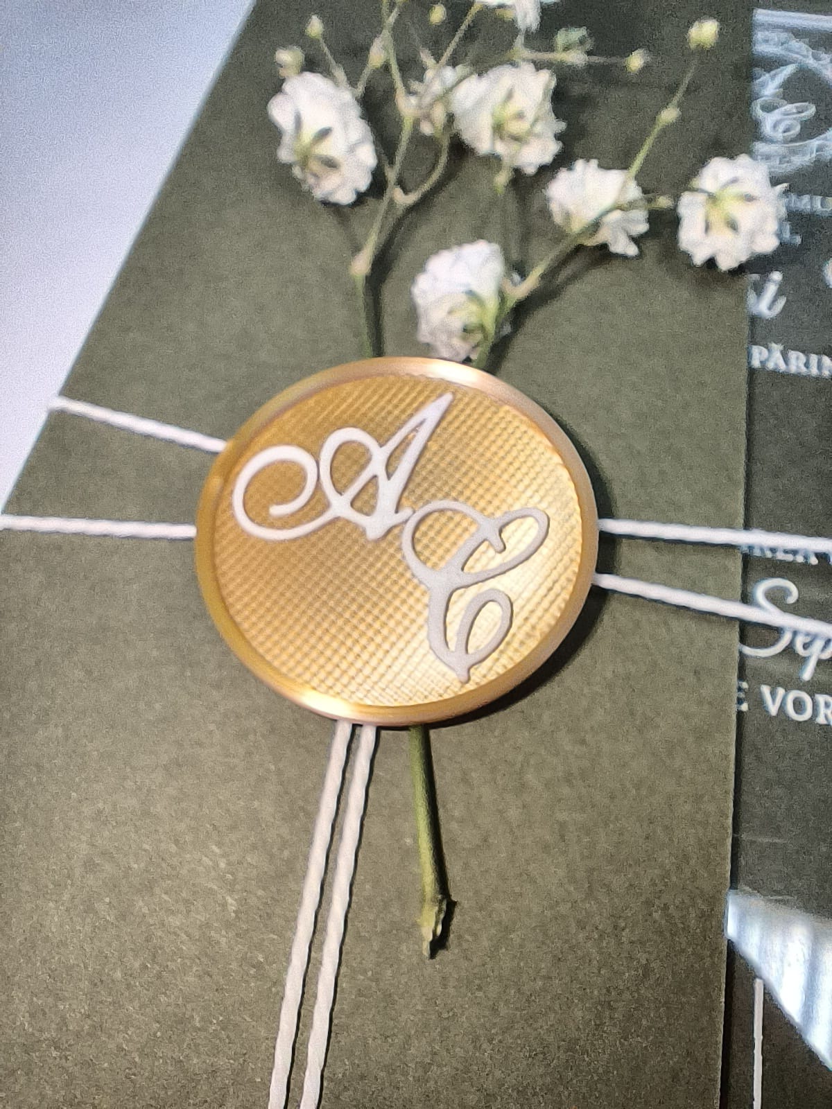Unica si de exceptie aceasta invitatie este completata de sigiliul personalizat, in doua culori, ce se armonizeaza perfect si inchide totul cu nota de rafinament si eleganta pe care o implementam mereu.