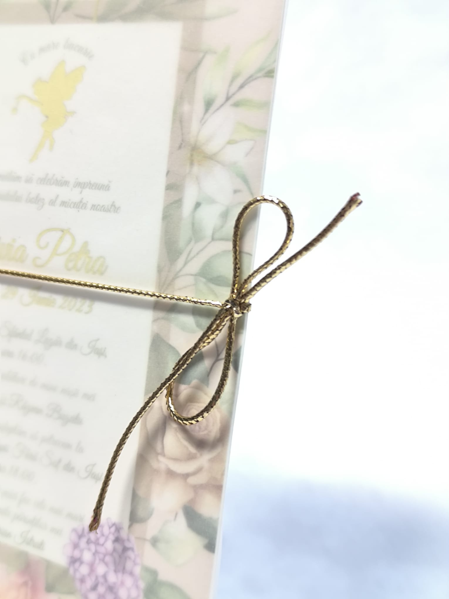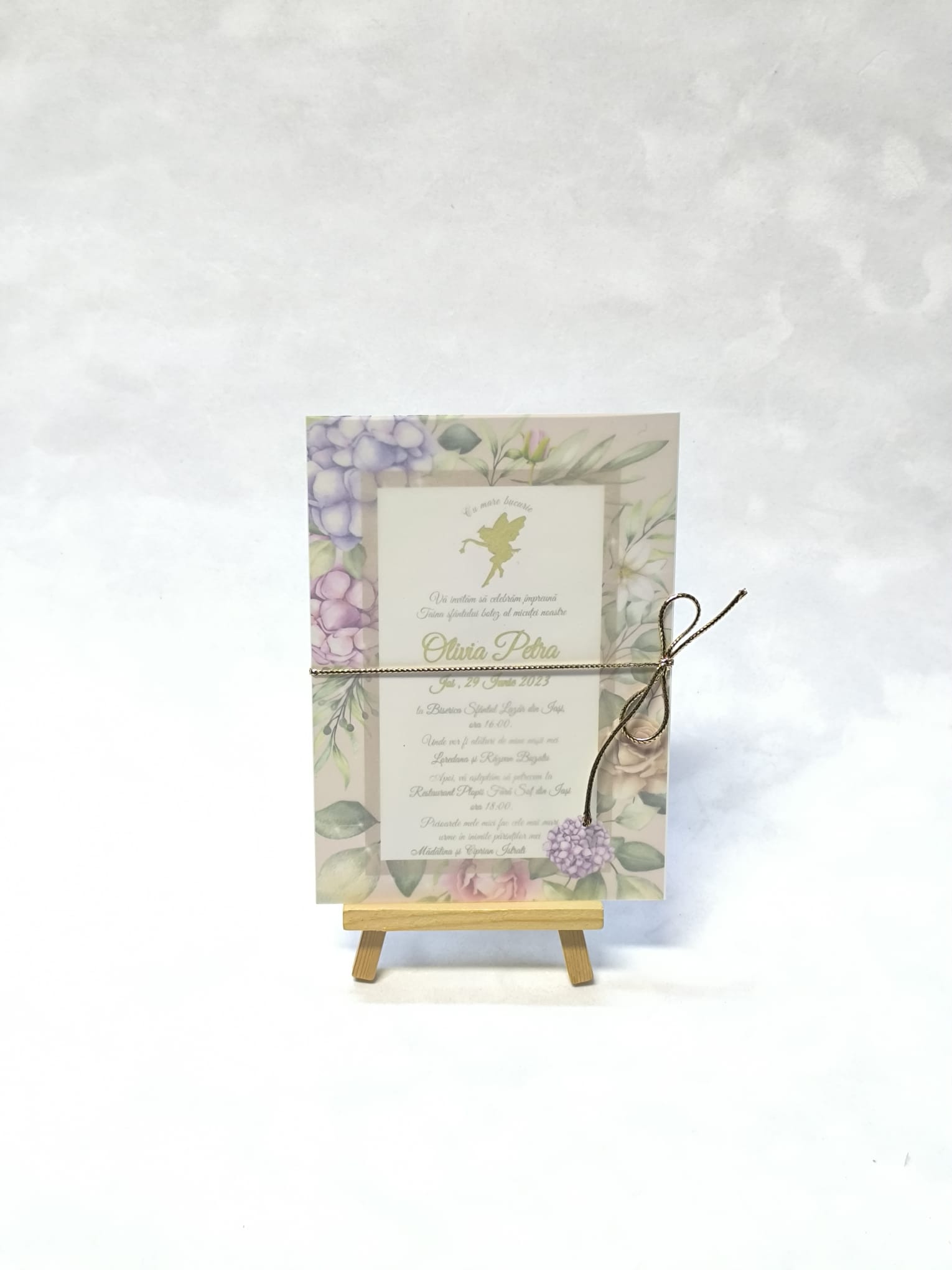 Magia primelor clipe prinde contur intr-o invitatie decorata cu o zana gingasa si flori delicate; care aduce lumina si bucurie inca de la prima privire.